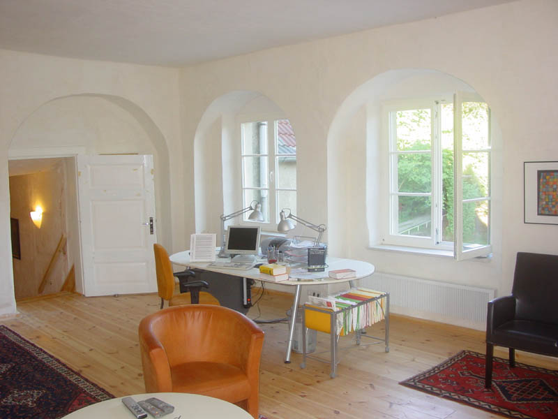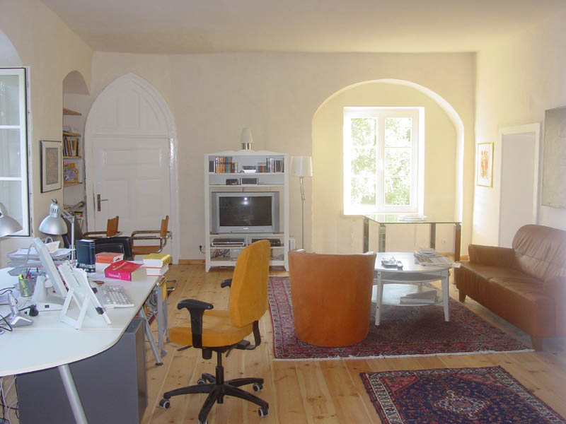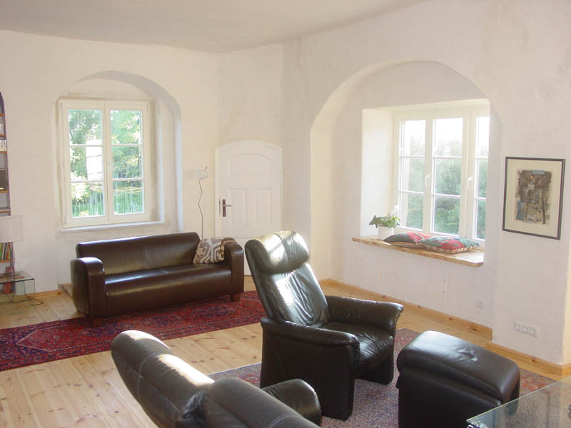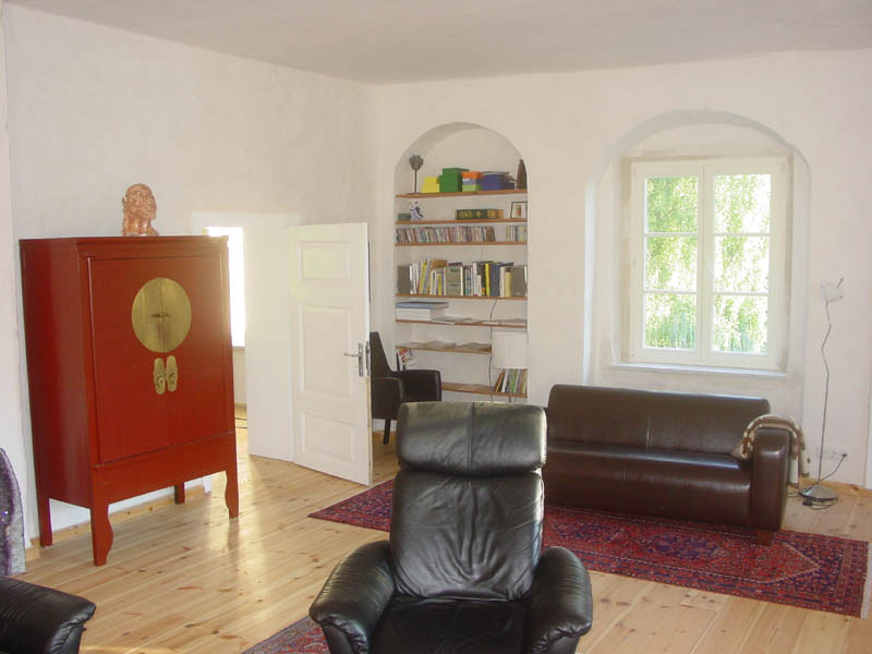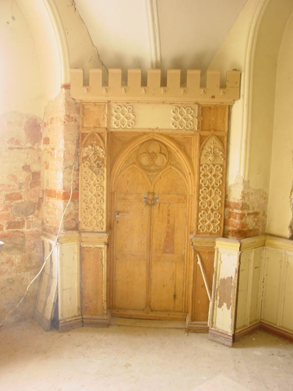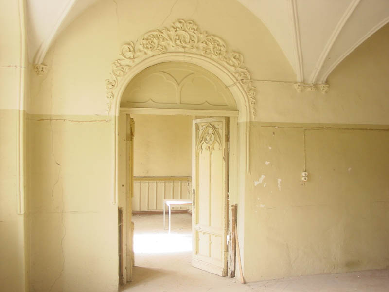 Door between dining room and tower in large apartment with towers in the lower floor.
