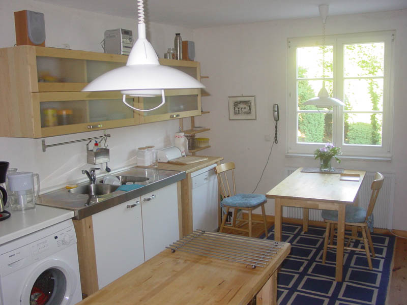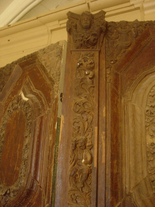 Doors between dining room and kitchen in large apartment with towers in the lower floor.
